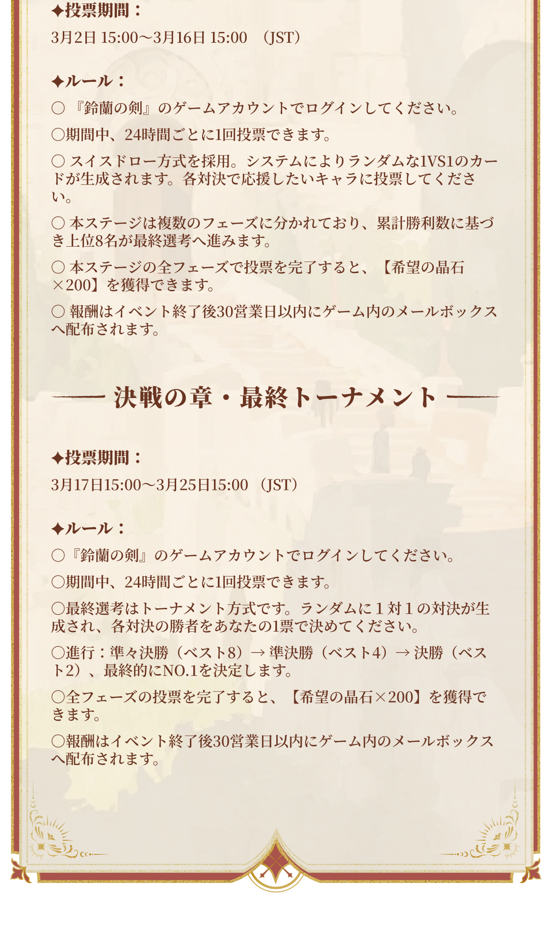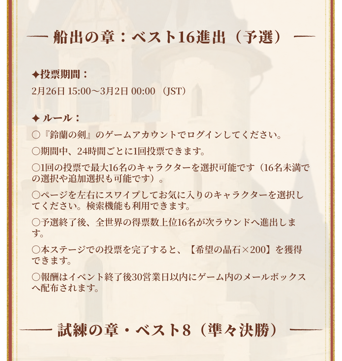 ○ 各ステージで投票に参加すると、ゲーム内報酬【希望の晶石×200】を獲得できます。3つのステージ全てに参加した団長は、合計で【希望の晶石×600】を獲得可能です。