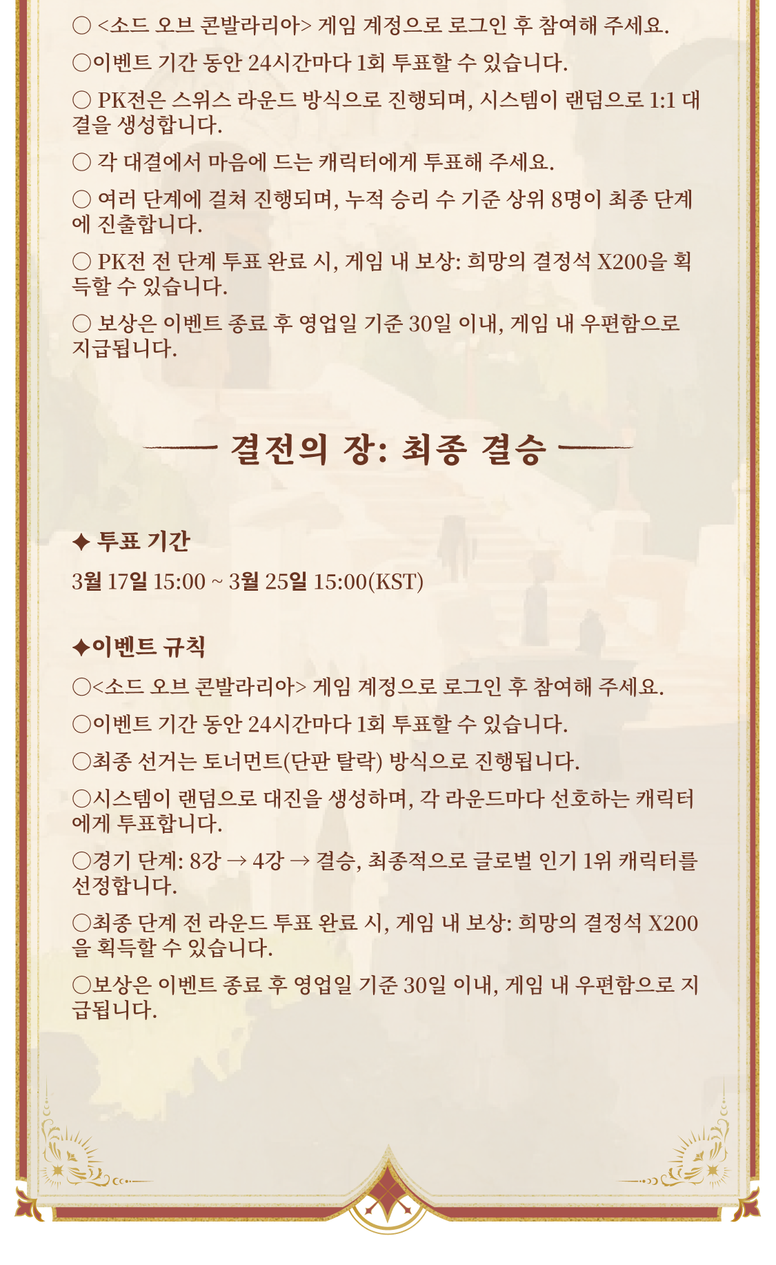 참여 보상: 최종 단계 전 라운드 투표 완료 시, 게임 내 보상: 희망의 결정석 x200을 획득할 수 있습니다.